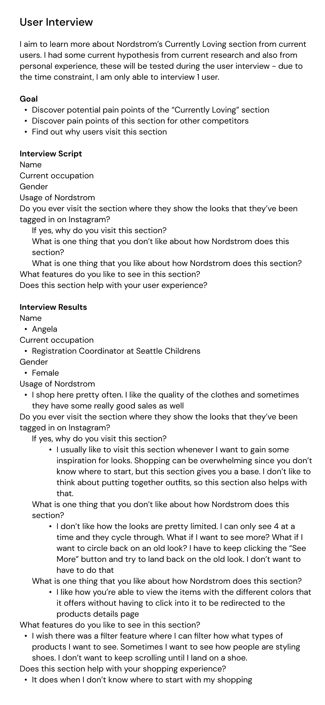 I wanted to conduct at least one interview - with someone who uses the Nordstrom app. This way, I could ask them open ended questions of why they look at this section.